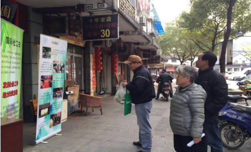 下午15:30,在上城区民政局的支持下,在王春霞老师的带领下,10位社工专业的同学在紫阳街道十五奎巷社区开展了“国际社工日”的宣传与宣讲活动,现场的社工同学积极向到场居民推广社工理念,介绍社工系的发展概况,社区居民对此表现浓厚的兴趣,宣传取得了良好的效果。
