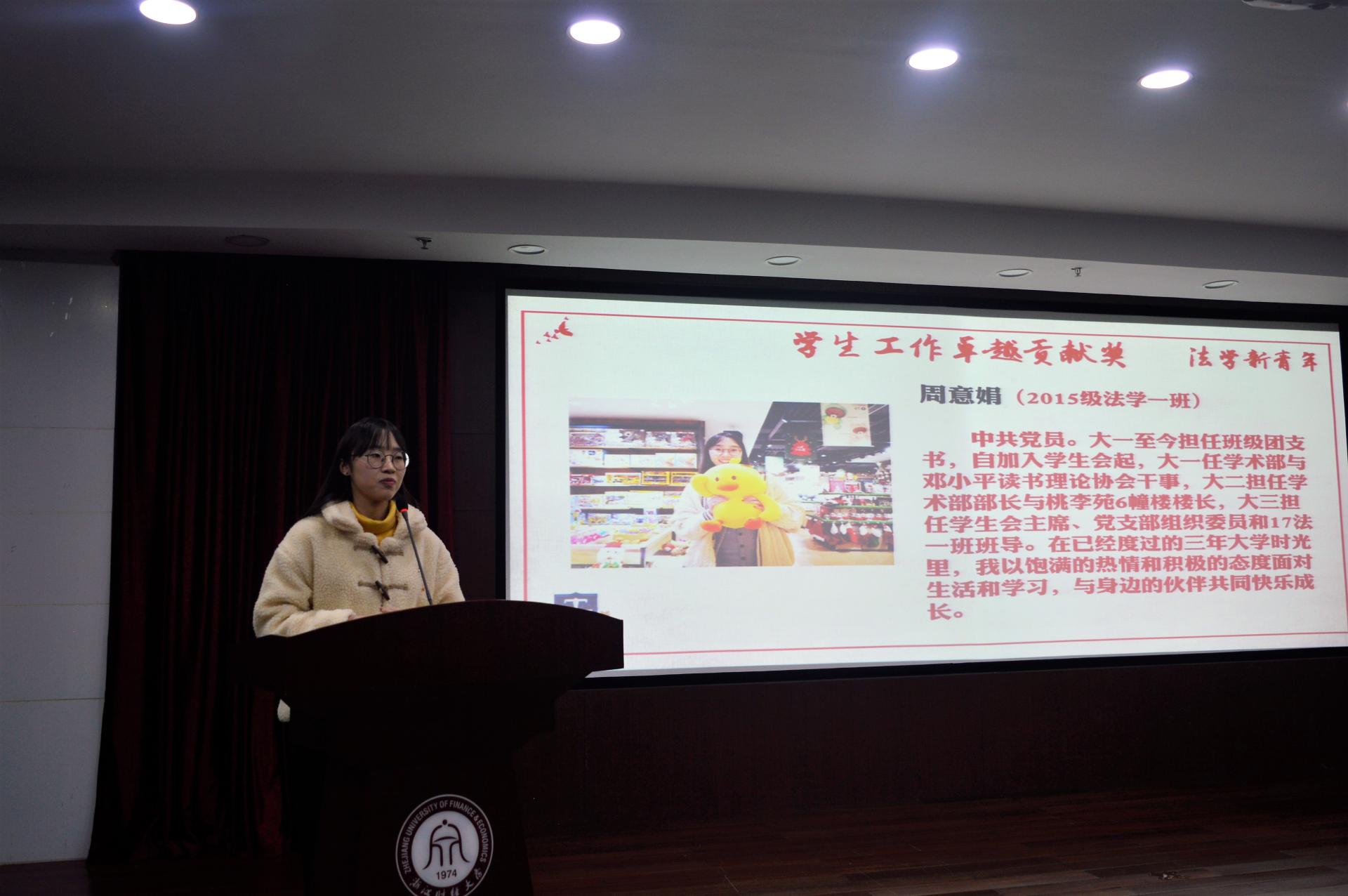 学生工作卓越贡献奖:15法学1班 周意娟,15法学非诉实验班 程雨,15法学非诉实验班朱奕颜