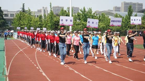 下沙校区西体育场上彩旗飘扬,运动员进行曲激昂嘹亮,来自各个学院的代表队精神抖擞、步伐整齐地步入会场,我校2019年第二十二届教职工健身运动会正式拉开序幕。