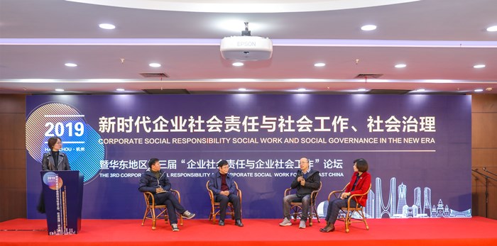 接下来都市快报公益部主任冯志刚,浙江省微笑明天慈善基金会副秘书长单励,上海大学教授彭善民,浙江大学教授林卡一同参与了“新时代企业社会责任”的圆桌讨论,在圆桌讨论中,冯主任分享了企业社会责任的浙江样本,单副秘书长谈及基金会参与企业社会责任实现“双赢”的心得体会,林卡教授和彭善民教授从学界的角度认为企业社会工作的发展不单单是企业的事情,而是需要多方联合参与,企业社会工作的发展应该走向更为专业化和在地化的阶段。