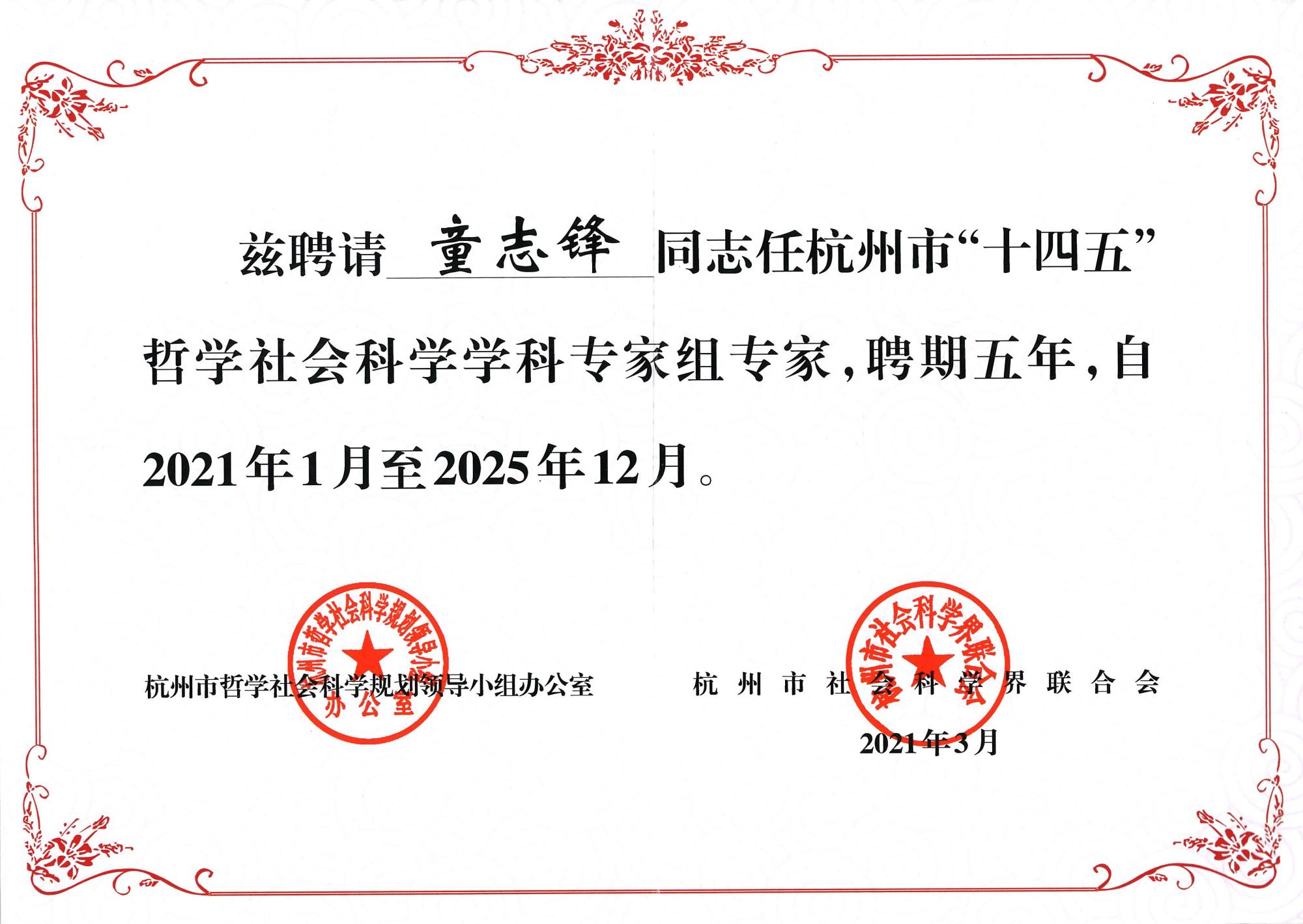 2021年3月,成人动漫 副校长李占荣教授、成人动漫 院长童志锋教授被聘为杭州市“十四五”哲学社会科学学科专家组专家。