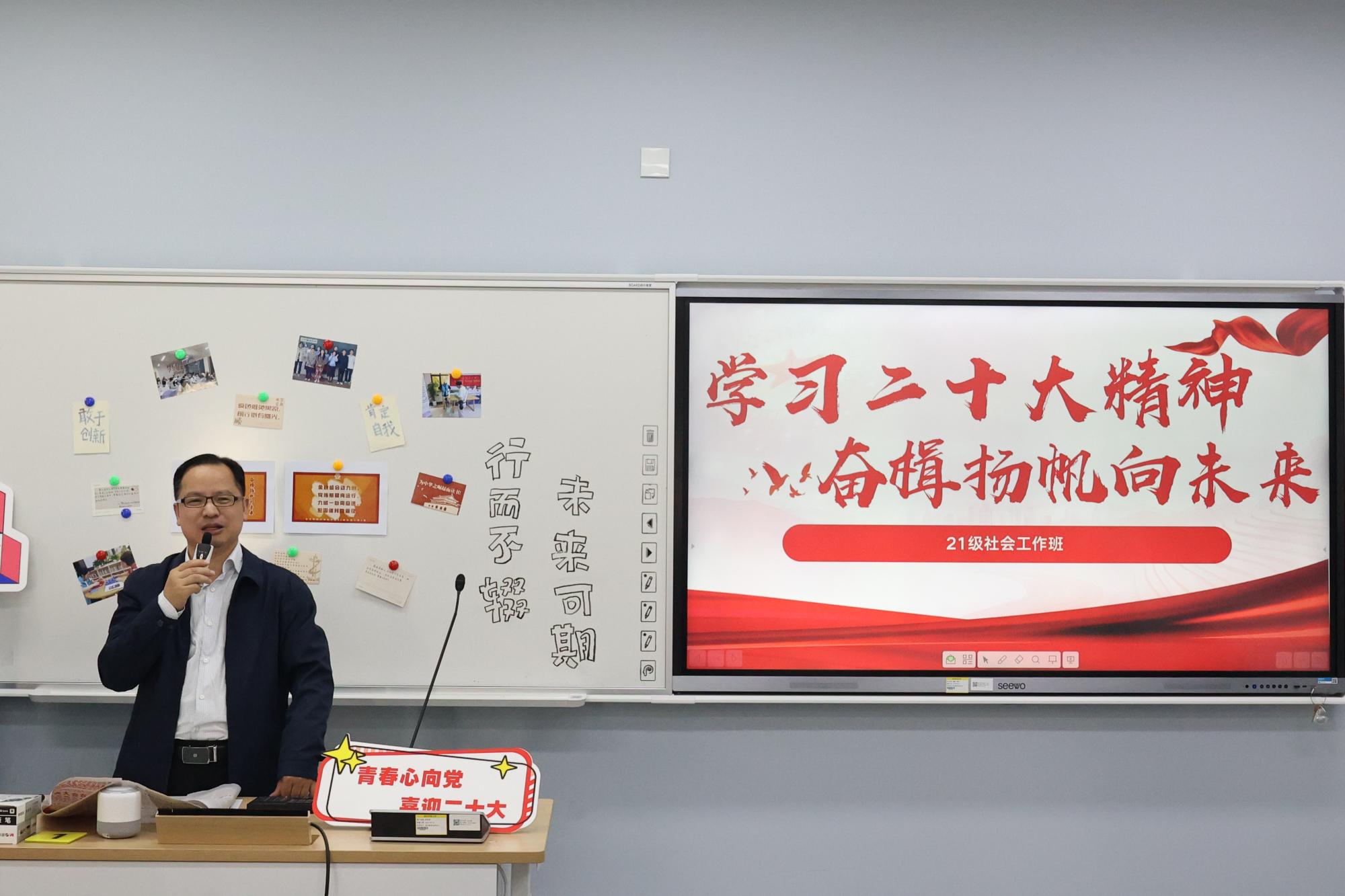 楼胆群用“学习创新理论”、“学习专业知识”和“学习担当精神”三组关键词系统解读和分享了党的二十大会议的精神内涵。他指出,一是“学习创新理论”,以习近平新时代中国特色社会主义思想为指引,牢牢把握中国式现代化的五点要求,不断提高思想站位;二是“学习专业知识”,以“江山就是人民,人民就是江山”为起点,讲述了社会工作专业在建设共同富裕,实现健康中国和促进文明发展等方面的重要作用;三是“学习担当精神”,他结合自身求学经历,勉励同学们要听党话、跟党走,身逢盛世要立志做有理想、敢担当、能吃苦、肯奋斗的新时代好青年。