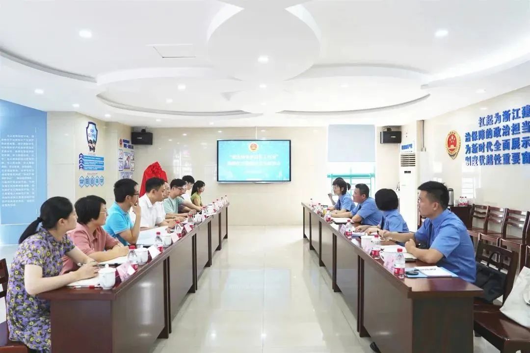 院长童志锋,桐乡市检察院党组书记、检察长陈国根共同为“童志锋专家团队工作室”揭牌。揭牌仪式结束后,双方围绕如何依托检校合作建设基层社会治理检察理论研究基地、打造新时代“枫桥式检察室”等议题开展座谈交流。