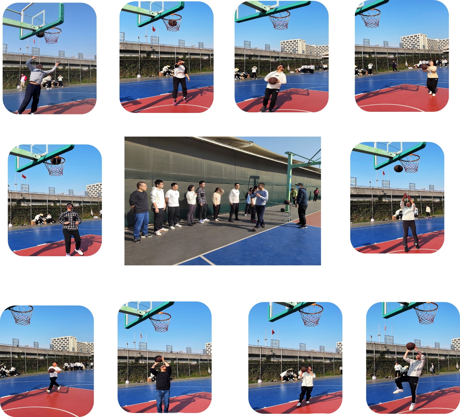分工会组织朱丹、唐勇、王文婷、徐文娟、王俊、陈思融、王婷、王春霞、魏腊云、孟涛、严城、曹璋、王龙辉、奚旖旎、童莉、那桢妮、刘静、王奥运、叶玮昱、朱晶晶、李森、冯姣、陈佳俊、徐稼钰、董振斌、陈波、郭静忆、龚金镭、杨雪、赵聪、吴培琦、王金建、姚秀芬、刘佳明、郭富民等35名教职工参加了本次运动会运球投篮、长绳连跳和拔河比赛等7个团体项目和男子60米(45周岁以上组)、男子铅球(45周岁以下组)和女子铅球(45周岁以下组)等4个个人项目。