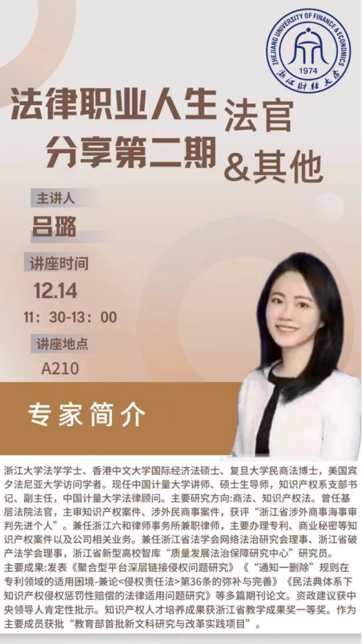 2023年12月14日,2023级非诉实验班班主任张晓晨老师邀请到了浙江省涉外海事商事审判先进个人、宾夕法尼亚大学访问学者、复旦大学博士、浙江六和律师事务所兼职律师、中国计量大学成人动漫