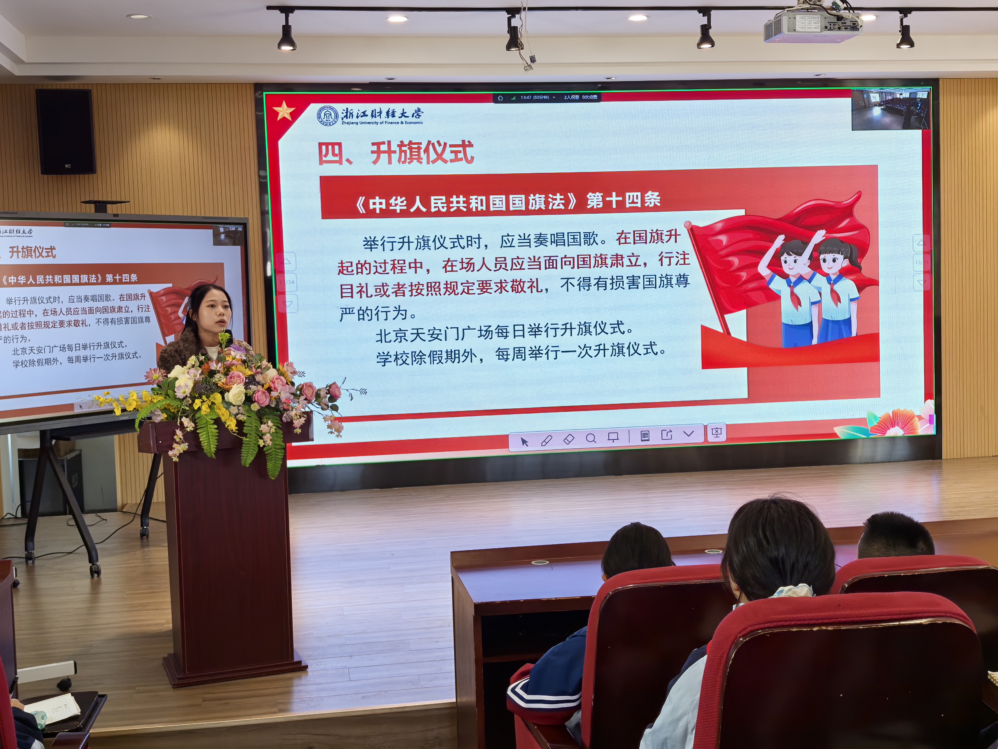 宣讲团成员们匠心独运,将原本枯燥的法律条文转化为生动有趣的互动课程,用通俗易懂的语言讲解《爱国主义教育法》《民法典》等法律法规,以五星红旗为引子,讲述国旗的日常使用、升旗仪式、降半旗的法条,让学生在轻松愉快的氛围中深刻理解并铭记这些重要知识,激发了学生的爱国情怀和法治意识。当宣讲团成员深情讲述《义勇军进行曲》成为国歌的历史时刻,那激昂的旋律仿佛穿越时空,让学生们亲身经历了国家从苦难中崛起、迈向辉煌的壮丽征程,对国歌的理解也从简单的音符升华为了对国家深厚情感的共鸣和对民族精神的深刻认同。