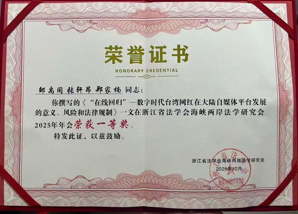 学生 张轩昂;福建省莆田市荔城区人民法院行政庭副庭长 郑家楠)所撰写的学术论文《“在线回归”—数字时代台湾网红在大陆自媒体平台发展的意义、风险和法律规制》在会议论文评选中荣获一等奖。