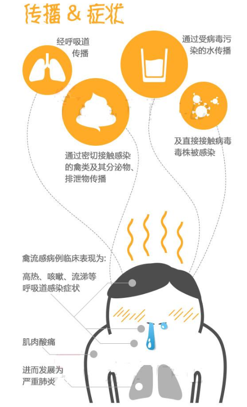 禽流感是由病毒引起的动物传染病,通常只感染禽类。人感染后的症状主要表现为高热、咳嗽、流涕、肌痛等,多数伴有严重的肺炎,严重者心、肾等多种脏器衰竭导致死亡。