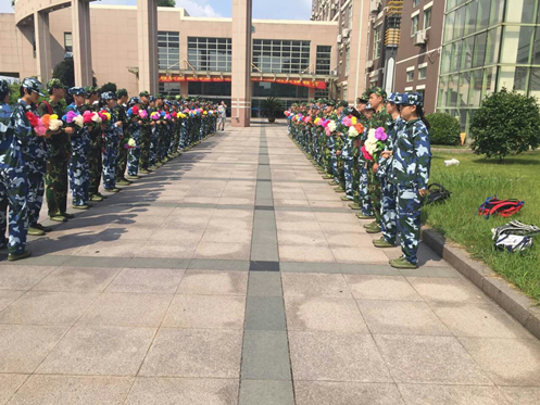 2015级新生身穿迷彩服,手捧花束聚集在学术报告厅前代表全校学生迎接教官。