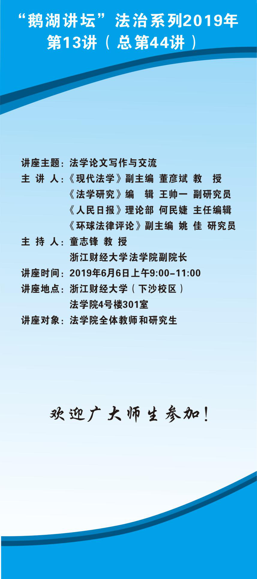 “鹅湖讲坛”法治系列2019年第13讲(总第44讲)《现代法学》副主编董彦斌教授、《人民日报》理论部何民捷主任编辑、《环球法律评论》副主编姚佳研究员、《法学研究》编辑王帅一副研究员
