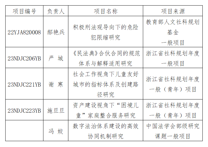 近日,成人动漫 多位教师获省部级科研项目立项。郝艳兵副教授获2022年度教育部人文社会科学研究规划基金一般项目立项。严城博士、施旦旦博士、谢寒博士获2023年度浙江省哲学社会科学规划年度一般课题立项。冯姣副教授获中国法学会2022年度部级法学研究课题立项。