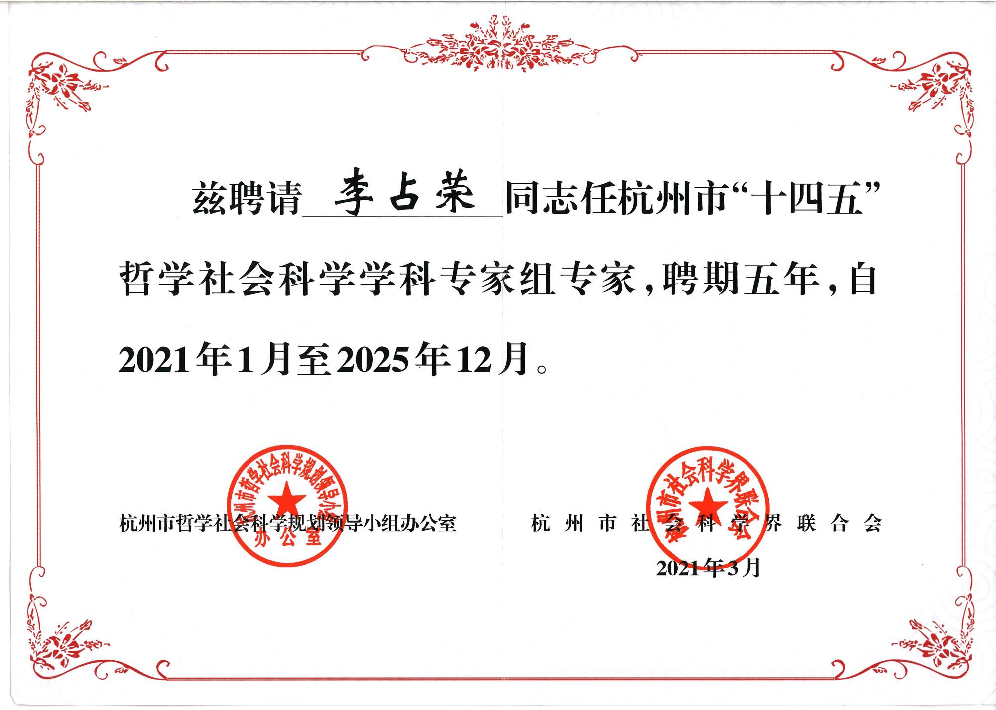 2021年3月,成人动漫 副校长李占荣教授、成人动漫 院长童志锋教授被聘为杭州市“十四五”哲学社会科学学科专家组专家