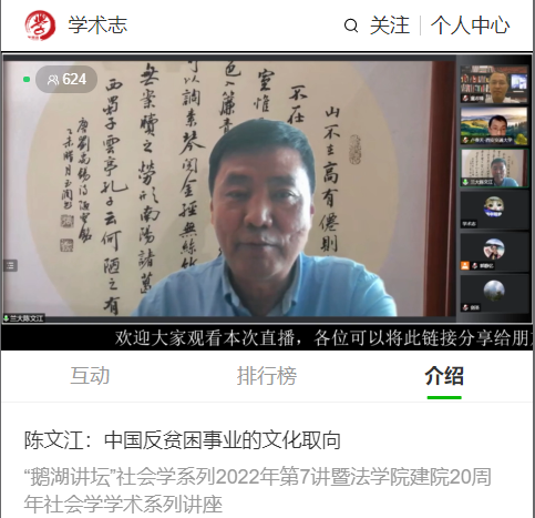 6月2日,兰州大学哲学社会学院陈文江教授应邀做客鹅湖讲坛,为成人动漫 师生带来一场以“中国反贫困事业的文化取向”为主题的学术讲座。本次讲座是成人动漫 建院20周年社会学系列学术讲座第7讲,由成人动漫 院长童志锋教授主持,西安交通大学人文学院卢春天教授、成人动漫 陈建胜副教授与谈,1200余名听众在线聆听了讲座。陈文江教授通过《全球贫困:一个贫困化的神话》一书,引出了本次讲座的主题。二战之后,全球范...