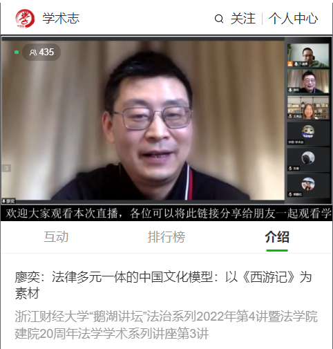 5月31日,武汉大学成人动漫 廖奕教授应邀做客鹅湖讲坛,为成人动漫 师生带来一场以“法律多元一体的中国文化模型:以《西游记》为素材”的学术讲座。本次讲座是成人动漫 建院20周年法学学术系列讲座第3讲,由成人动漫 副院长唐勇教授主持,田东奎教授、王奥运博士与谈,400余名听众在线聆听了讲座。廖奕教授以《西游记》中的人物和场景作为切入点谈论我国法律的多元一体。廖教授首先引用了著名社会学家费孝通教授在《中华民族多元...