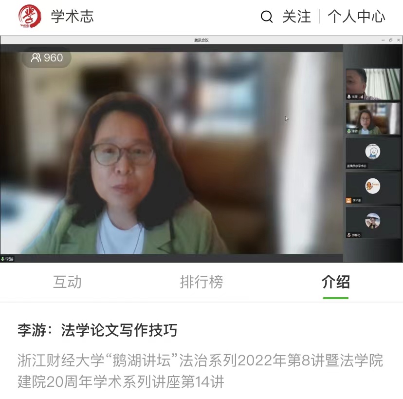 6月9日,《中国法学》杂志社总编室主任李游教授做客鹅湖讲坛,为我校师生带来一场题为“法学论文写作技巧”的学术讲座。本次讲座是成人动漫 建院20周年学术系列讲座第14讲,由成人动漫 田东奎教授主持,近千名观众在线聆听了本次讲座。李游教授从论文选题、写作步骤和投稿技巧三方面展开,从选题思路、大纲构建、引证规范、内容提要、研究方法等各个方面对法学论文的写作与技巧进行了全面系统的讲解。李游教授结合自身写...