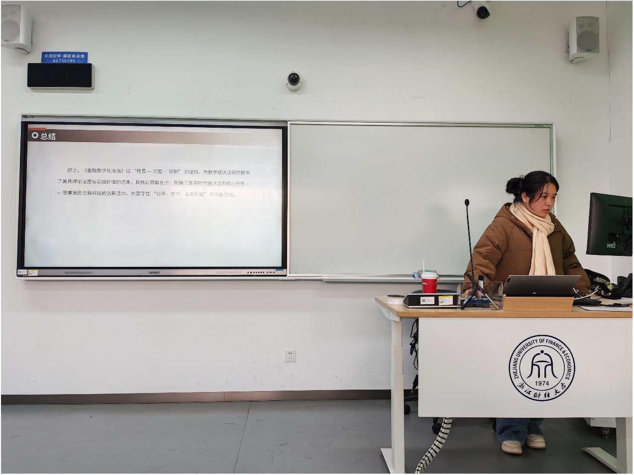 2025年11月27日下午,第十五期经济法研究生读书会在A107A教室举行。会议由25级研究生陈欣颖主持,陈波老师、刘静老师及24级、25级经济法研究生参加。24级研究生安倩作为主讲人,对徐东根教授《金融数字化法治》一书进行汇报。 安倩通过思维导图将全书内容分为核心定位、基础理论、核心议题及展望四部分,并重点阐述了金融活动数字化监管、数据管辖权、代码算法治理等八大议题。她介绍了书中提出的“数字科技治理+法律治理”二...